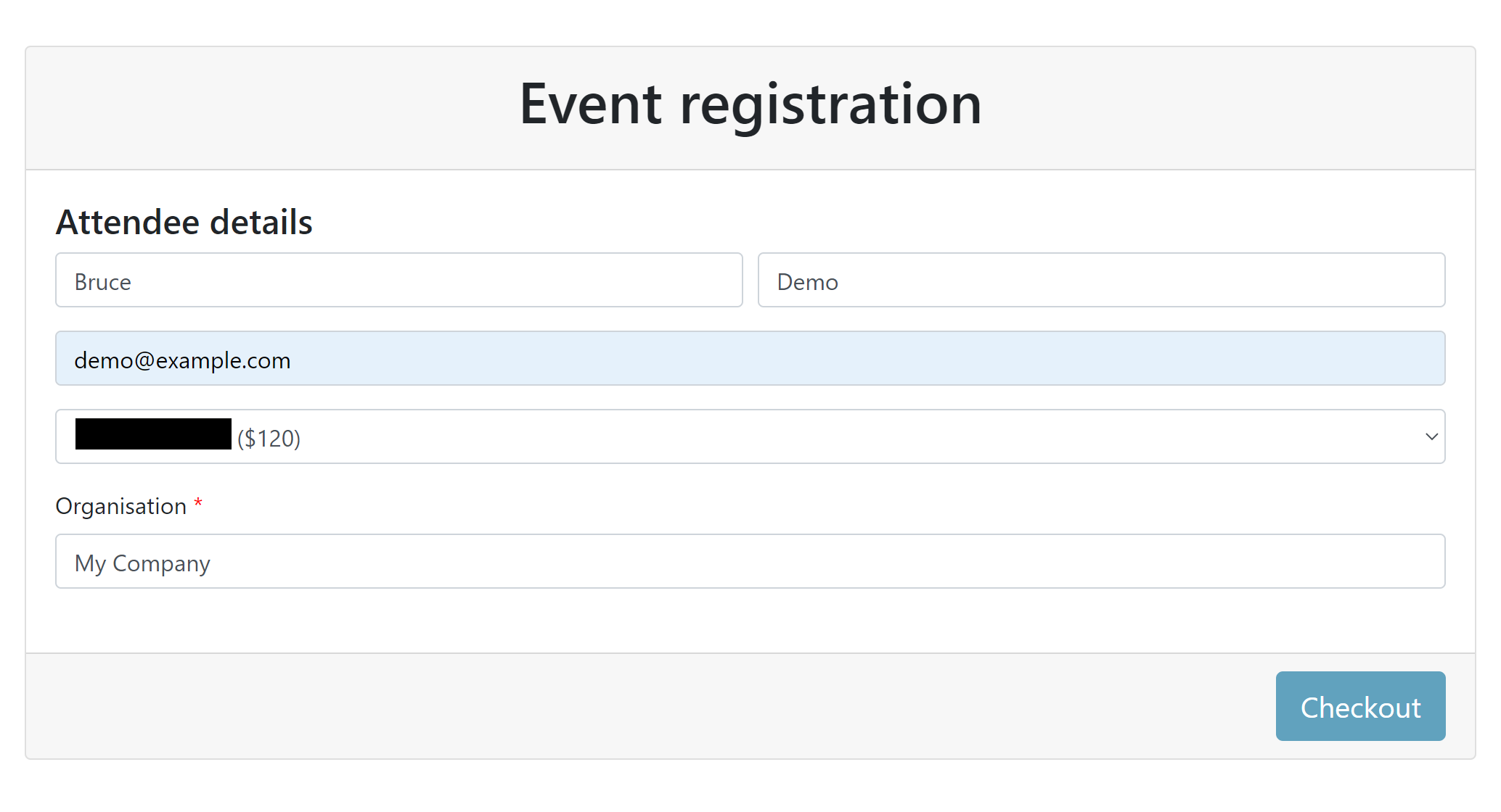So this was the flow of the registration. The attendee populates their details, chooses the pass and clicks on checkout: