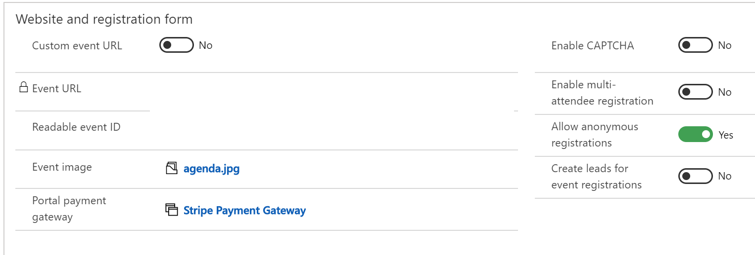 - Within the event record itself in Dynamics, we set the payment gateway to the page we created above: